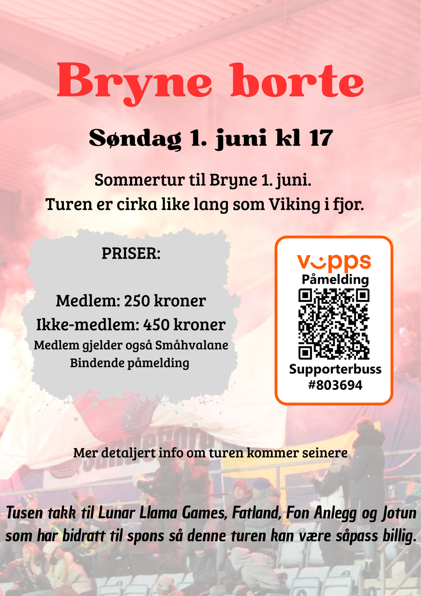 Har du mulighet og lyst til å være med til Bryne, meld deg på bussen. Det er en fin tur å innlede sommeren med, og vi håper at det blir med flere. Kanskje må man ofre et par timer søvn, men det skal nok gå fint.