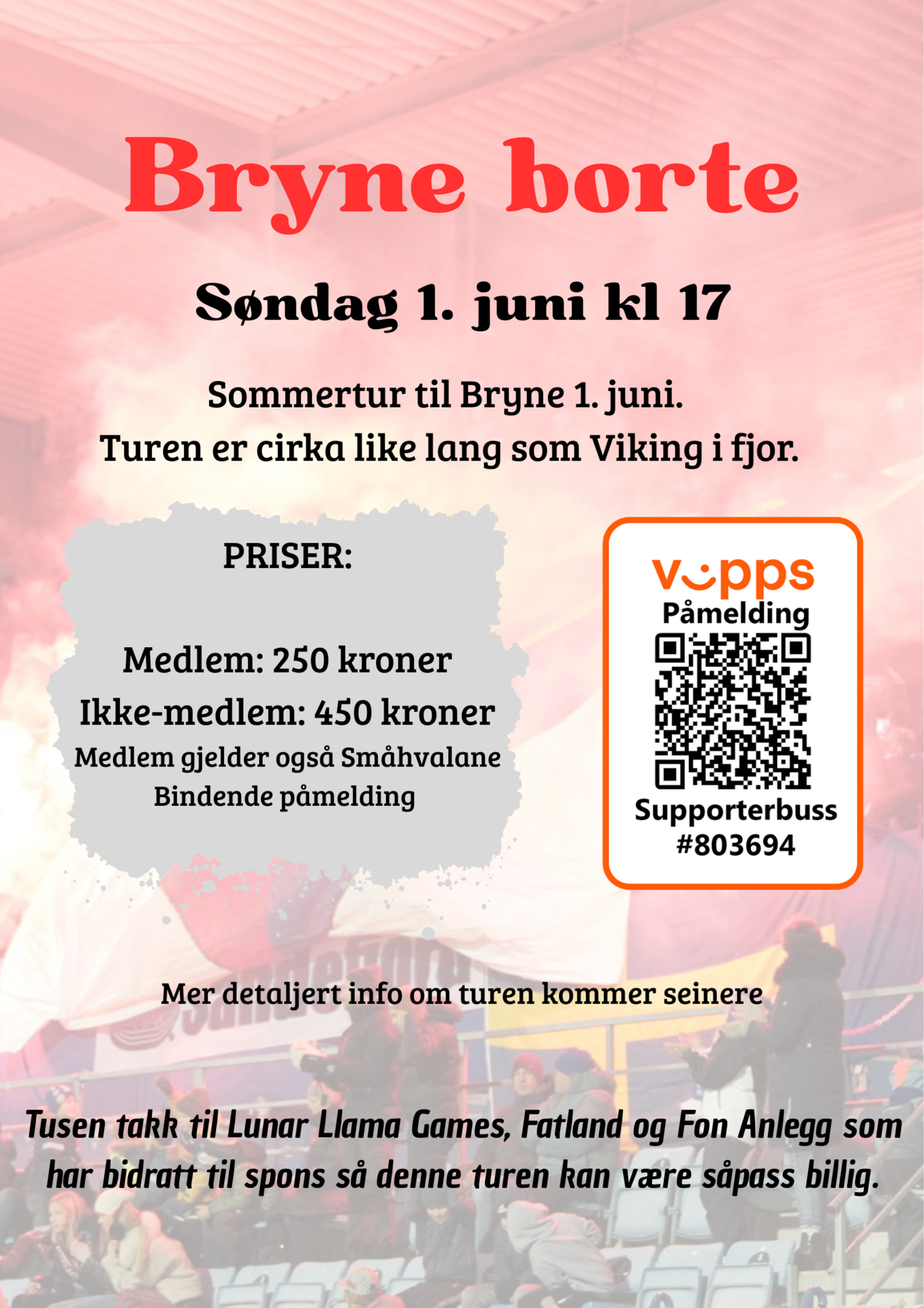 Vi kjører en ny, lang bortetur i år. I fjor var det Viking i november, nå er det naboen litt lenger sør, Bryne, 1. juni. Start sommeren på tur med dine blå medsupportere!