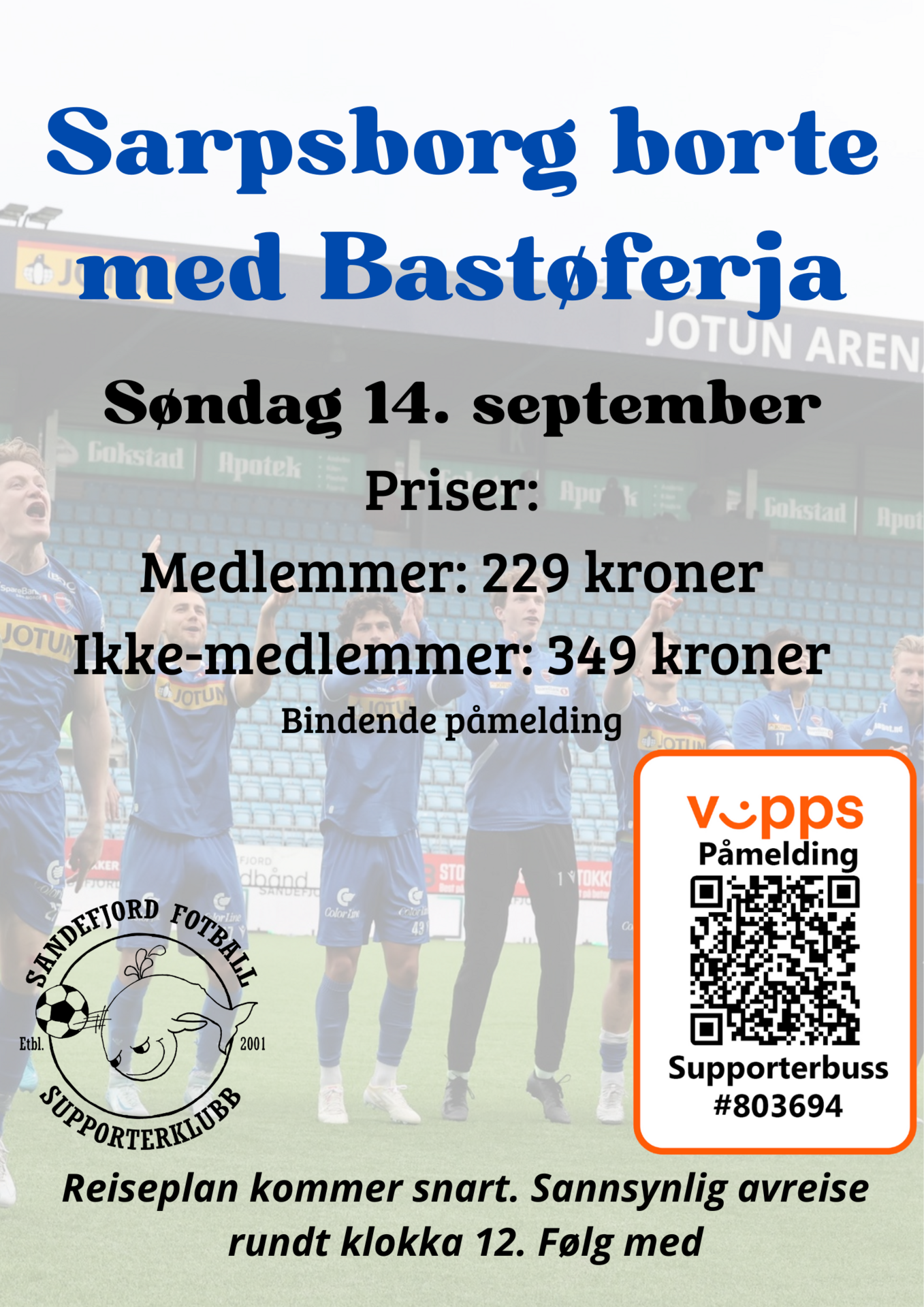Vi setter også opp en buss som tar den kortere veien. Vi kommer tilbake til reisetidspunkter på denne bussen når vi har avklart hvor vi skal være før kampen i Sarpsborg, men sannsynlig start vil være rundt klokka 12.