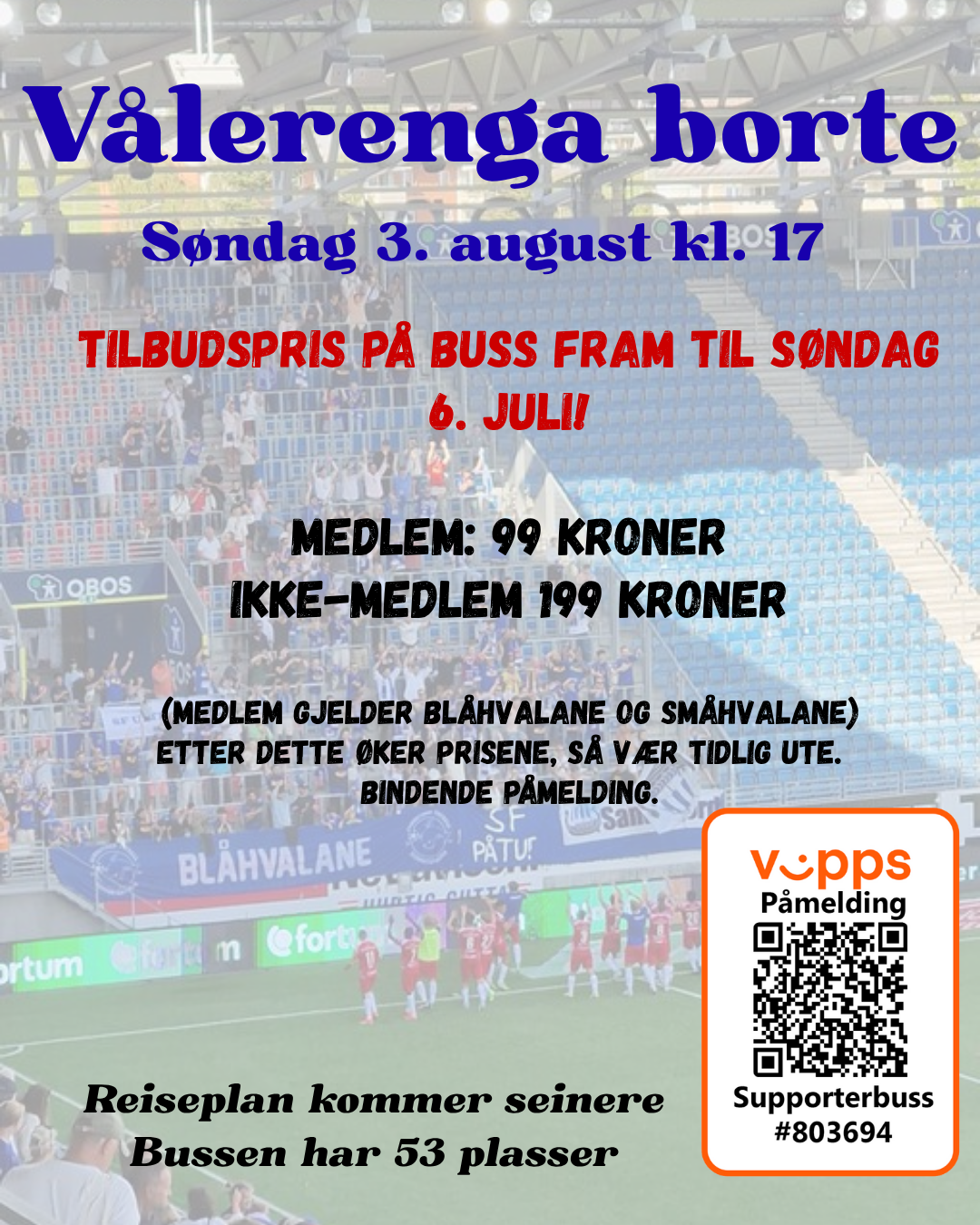 Søndag 3. august klokka 17 møter vi Vålerenga borte på Intility Arena. Vi setter opp buss og håper at du blir med på bortekamp.