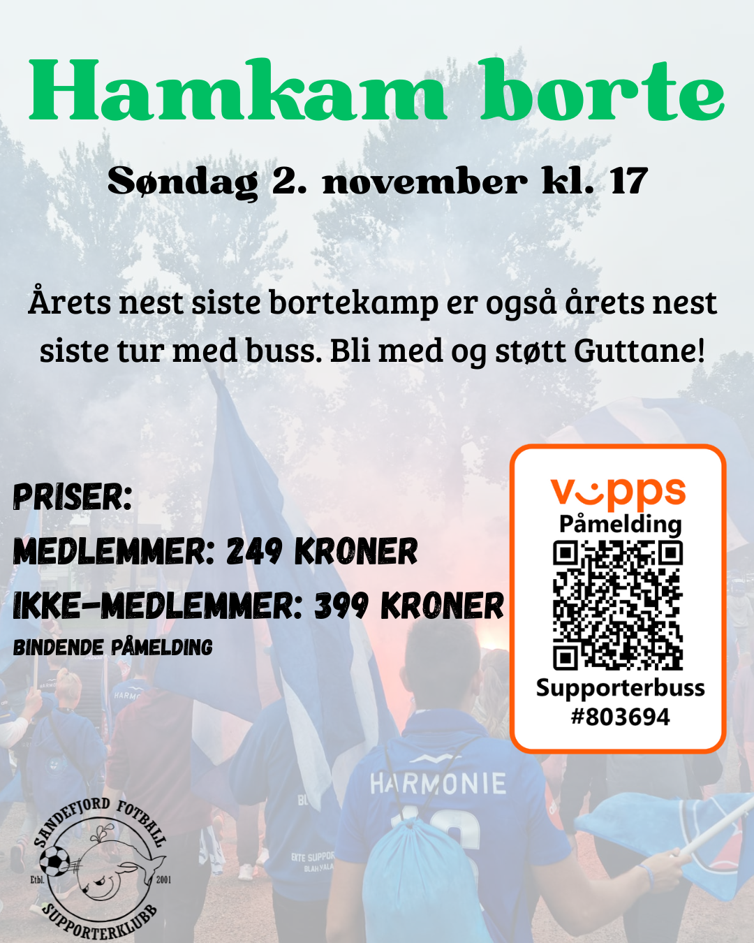 Vi har satt opp buss til Hamkam borte som vi håper mange blir med på. Den spilles søndag 2. november og er vår neste siste bortekamp for året. I fjor var vi 101 pesoner på bortefeltet, det burde vi øke litt i år.
